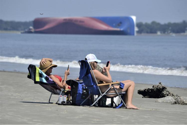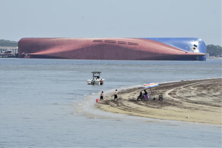 The Golden Ray has been drawing onlookers every since it rolled over. The MV Golden Ray was a 200-metre (660 ft)-long car carrier that capsized on 8 September 2019 . She was eventually declared a total loss, and is being removed as scrap. We were camping on Jekyll in February of 2020 and saw the work just beginning.