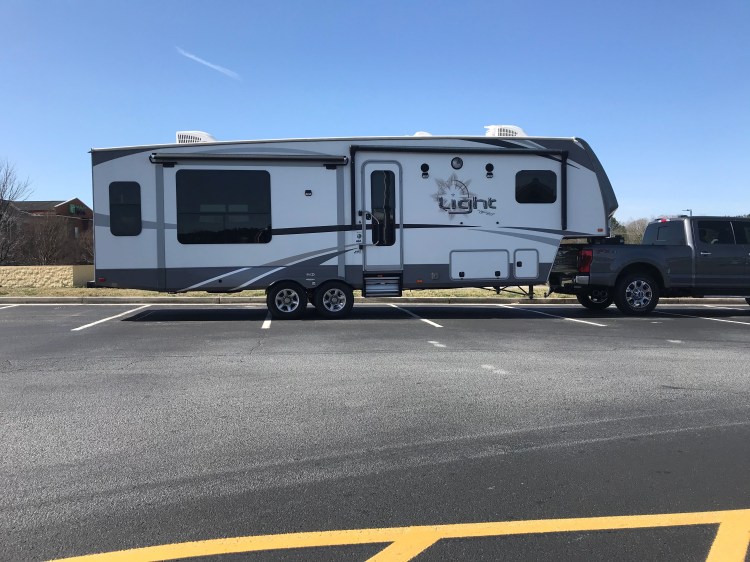 When I bought a new 2021 F350 Super Duty and put a B&W Companion fifth wheel slider hitch in it I found that I could no longer get completely level. Taking the rig out to a fairly level parking lot I found that the front end of the camper frame is 1/2 inch higher than the back end when measuring from the frame on both ends. A phone call to Open Range support got me a quick reference to a local-to-them hitch shop. I tried to call the shop but didn’t get an answer and did not retry. As I thought about it I decided that the best solution would probably be in changing out the king pin to whatever Lippert suggests for this truck. The kingpin that came on this Open Range Light 318 RLS is a combo gooseneck/fifth wheel king pin. The reason I am thinking that this is my best option is because I can tolerate losing a half inch in distance between camper and bed rails. For some people this could be a problem, especially if they are already at bare minimum on clearance there. Here is a picture of my rig as it currently is. I don’t think this is a problem. Do you? I have never taken it to the scales to try and get the weight on each axle. Do you think I should? If that is possible I guess that would show me how much the tilt is shifting the weight toward the back axle.